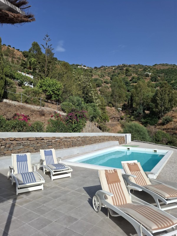 Der gemeinsame Pool der Finca RustiQ befindet sich an einem ruhigen, abgelegenen Ort etwas tiefer auf dem Gelände. Über eine Treppe und einen Weg durch den Garten gelangt man dorthin, vorbei an der Bepflanzung und den Obstbäumen, die das Gelände umgeben. Da der Pool nicht direkt an die Apartments grenzt, bleibt die Privatsphäre vollständig gewahrt. Hier können Sie ungestört sonnenbaden und entspannen, während die Ruhe bei den Apartments genauso intakt bleibt.